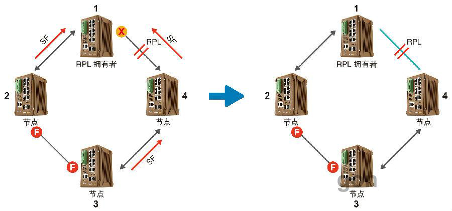 2.ERPS通過阻塞RPL鏈路,確保不會形成環路。在上圖中,節點1和節點4之間的鏈路為RPL鏈路。
